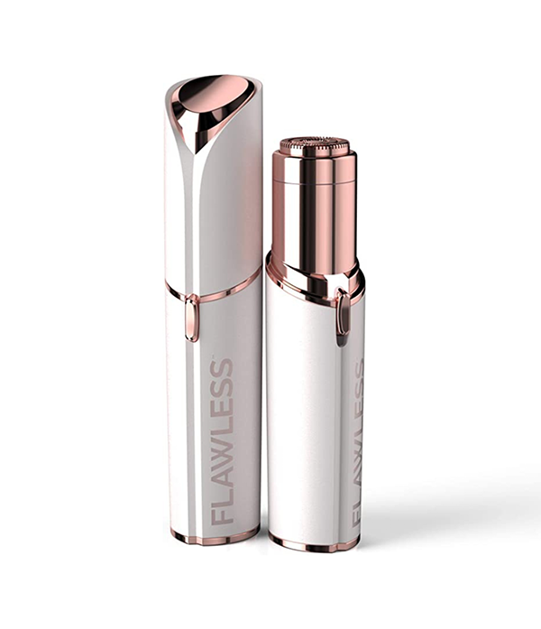 • One Finishing Touch Flawless Facial Hair Remover, Rose Gold stainless steel blade hair remover device for women features 18 karat gold plating and LED light for precision